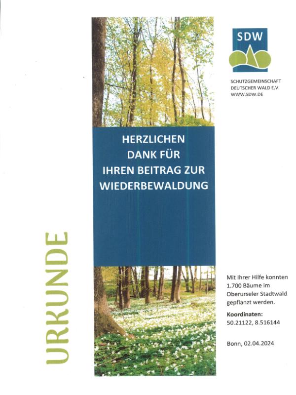 Hierfür haben wir eine Urkunde von der Schutzgemeinschaft Deutscher Wald e.V. erhalten.